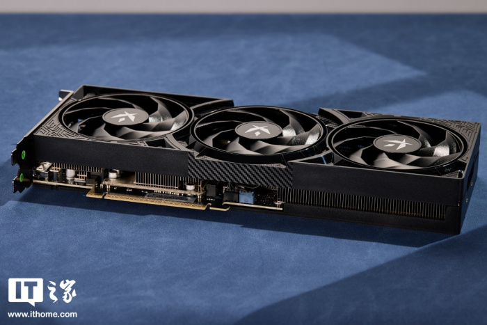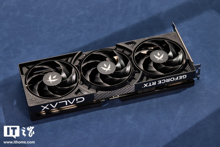 其实这个外观在之前的影驰 RTX 5090 D 大将上就见过,只是风扇由黑透改为了黑色,风扇上的 Logo 也不一样,但中间风扇周围的一圈“尖刺”设计仍旧得以保留,“旭日黑铠”直接传承了过来。
