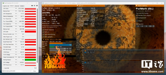 烤机环节,影驰 GEFORCE RTX 5070 FIRE 显卡在甜甜圈单烤 20 分钟后,GPU 功耗稳定在了 250W,GPU 主频为 2415MHz,而 GPU 温度 71.5℃。其中 GPU 主频给的稍微有点保守,并没有上到 2500MHz,但也在标称的主频区间内。