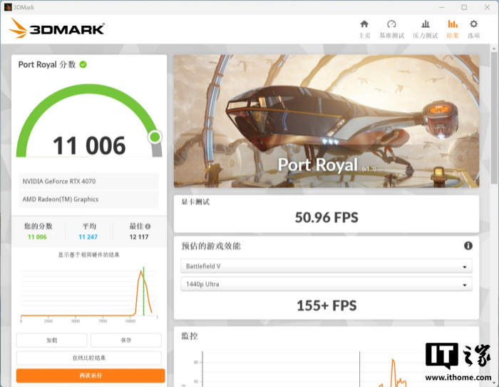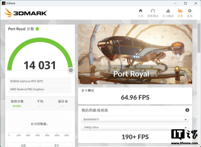 在 3DMark Portal Royal 实时光追测试中,影驰 GEFORCE RTX 5070 FIRE 显卡的综合分为 14031 分,对比 RTX 4070 的 11006 分,提升幅度达到了 27.5%。