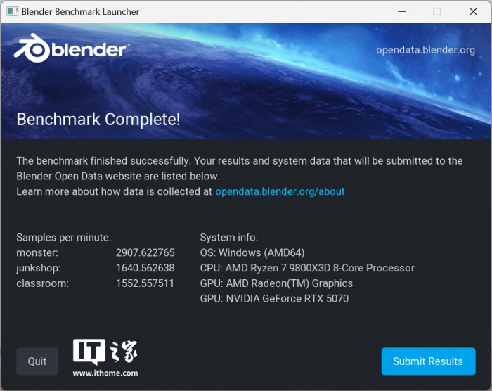 在 Blender 基准测试的 3 场景渲染中,影驰 GEFORCE RTX 5070 FIRE 显卡的渲染性能相较于 RTX 4070 显卡提升分别约为 13.8%、30.1%、17.1%。