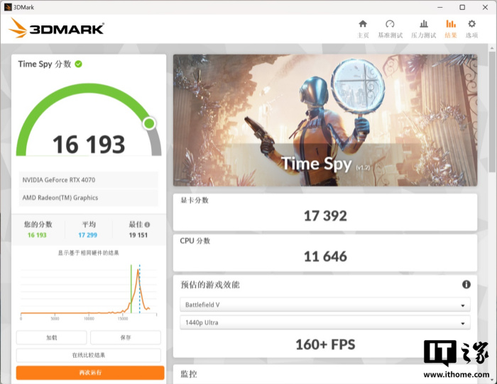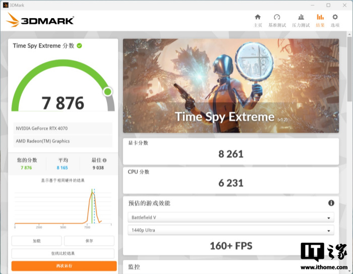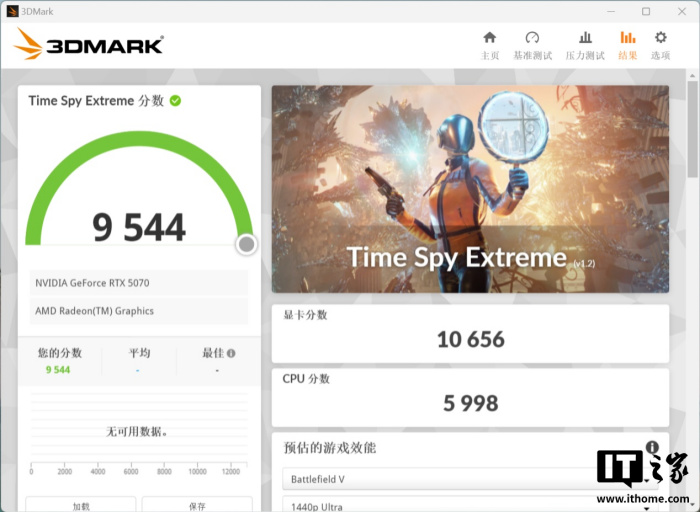 在 3D Mark Time Spy Extreme DX12 测试中,影驰 GEFORCE RTX 5070 FIRE 显卡得分达到了 10656 分,对比 RTX 4070 的 8261 分,提升幅度约 28.9%。