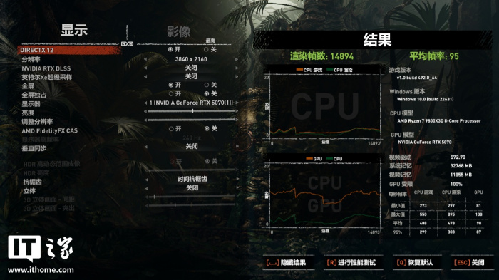 RTX 5070 在 4K 分辨率 + 最高画质下,游戏平均帧数为 95 帧,1% Low 帧 83 帧;