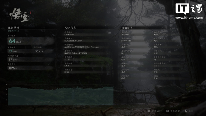 RTX 5070 在 4K 分辨率 + 超高画质 + 50% 超采样分辨率 + 高全景光追 + 帧生成下,游戏平均帧数为 64 帧,1% Low 帧 53 帧;