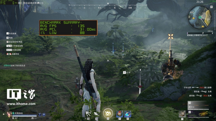 随后,当我们在设置菜单中开启 2x、3x 和 4x 多帧生成选项后,RTX 5070 的游戏平均帧数分别提升到 136 帧、170 帧、199 帧;而游戏平均延迟方面分别为 31ms、36ms 和 41ms。大家不难发现,开启多帧生成后游戏的平均延迟竟然还降低了,只有 4x 多帧生成下,平均延迟才回升到不开多帧生成时的 41ms,毫无疑问 DLSS 4 技术配合 Reflex 低延迟技术,在竞技游戏中的延迟表现完全可以接受。