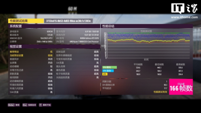 RTX 5070 在 2K 分辨率 + 极端画质下,游戏平均帧数为 166 帧,1% Low 帧 138 帧;