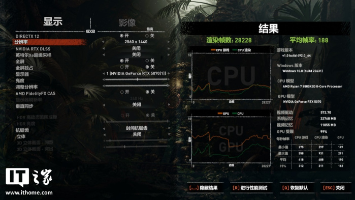 RTX 5070 在 2K 分辨率 + 最高画质下,游戏平均帧数为 188 帧,1% Low 帧 141 帧;