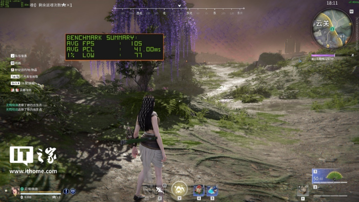 首先,RTX 5070 在 4K 分辨率 + 最高画质 + DLSS 质量模式下,游戏平均帧数为 105 帧,1% Low 帧 77 帧,平均延迟 41ms;