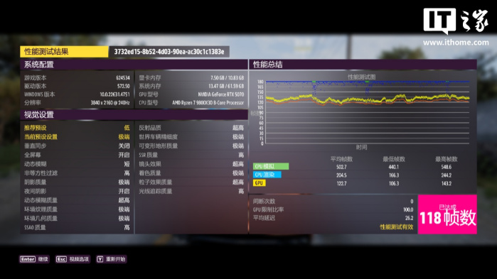 RTX 5070 在 4K 分辨率 + 极端画质下,游戏平均帧数为 118 帧,1% Low 帧 101 帧;