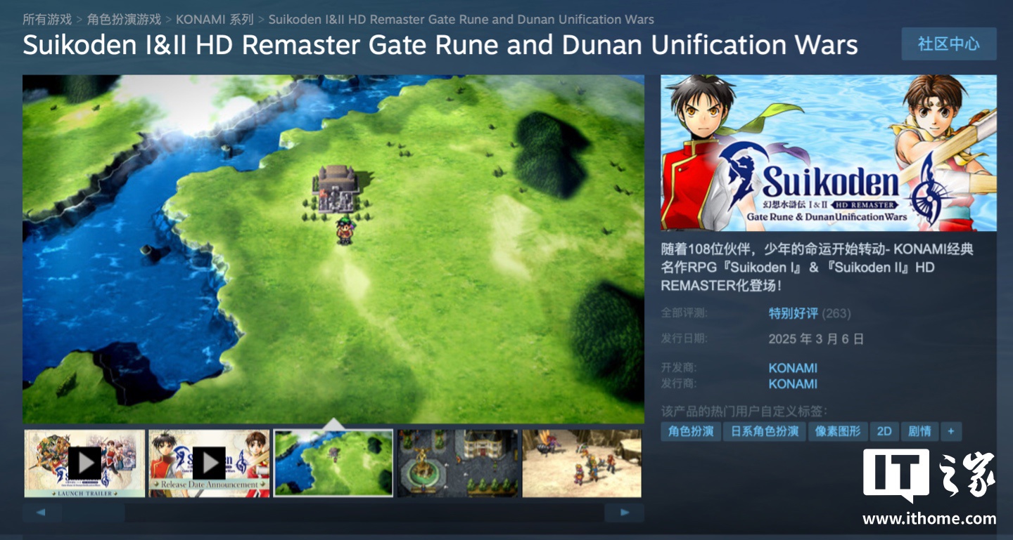 IT之家 3 月 7 日消息,科乐美旗下《幻想水浒传 I&II 高清重制版(Suikoden I&II HD Remaster)》现已正式发售,登陆 PS4、PS5、Xbox One、Xbox Series X|S、Switch、PC 平台,其中游戏在 Steam 国区定价为 168 元(点此访问),截至IT之家发稿游戏好评率 94%“特别好评”。