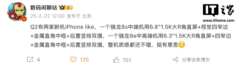 该机有望采用 6.55 英寸微曲面四曲屏,分辨率达到 1.5K,将首发高通骁龙 8s 至尊版芯片。