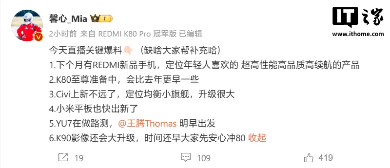 IT之家 3 月 7 日消息,在今晚的“聊聊 REDMI K80 销量成绩背后的故事”直播活动中,REDMI 品牌总经理王腾和 REDMI 产品经理胡馨心放出了多款新品的有关消息。