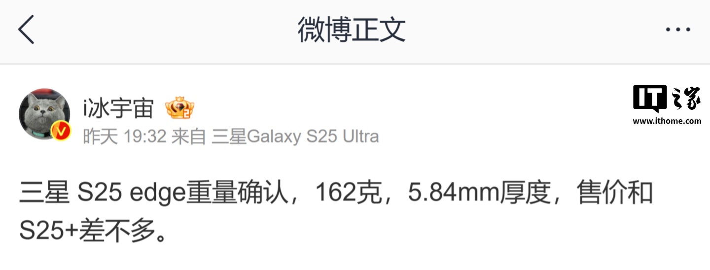 IT之家 3 月 8 日消息,消息源 @i冰宇宙 昨日(3 月 7 日)发布微博,曝料称三星最薄旗舰手机 Galaxy S25 Edge 机身重量为 162 克,厚度为 5.84 毫米,售价和 S25 + 差不多。