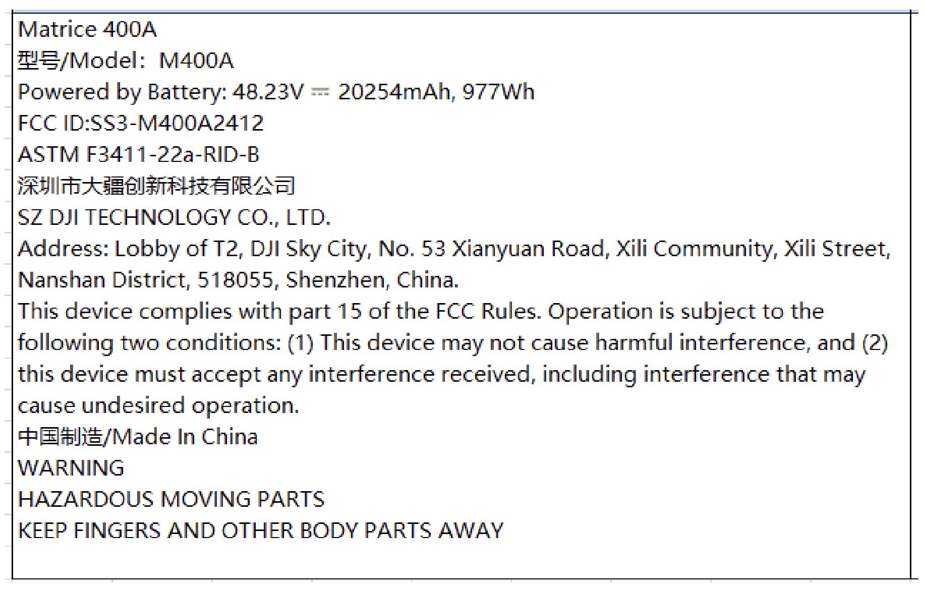 根据 FCC 认证文件显示,大疆 Matrice 400A 企业无人机搭载的电池容量为 977Wh,与今年 1 月泄露的信息一致。FCC 提供的图片显示,无人机可能采用金属加工电池仓,但具体设计细节尚不明确。