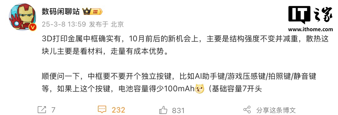 IT之家 3 月 8 日消息,博主 @数码闲聊站 今天透露一款神秘新机将采用 3D 打印金属中框,预计 10 月前后上市,该机采用相应中框可在“保证结构强度的同时减轻机身重量”,同时也有望提升手机散热水平,并降低制造成本。