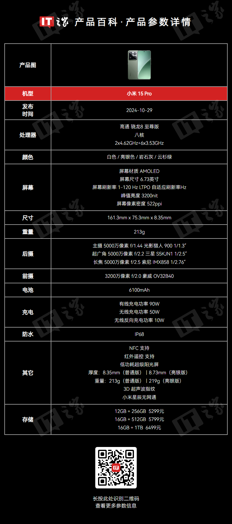 作为比较,小米 15 Pro 手机于去年 10 月 29 日发布,该机搭载高通骁龙 8 至尊版,堪比 PC 级性能;还有小米 HyperCore 加持,内置自研微架构调度器;配备 LPDDR5X RAM + UFS 4.0 闪存;采用翼型环形冷泵散热系统,散热面积高达 4053mm²,定价 5299 元起。
