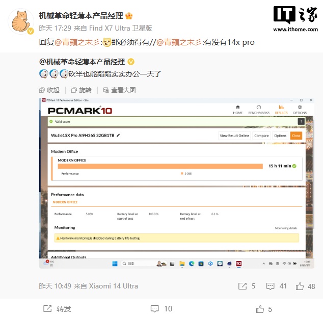 IT之家 3 月 8 日消息,机械革命轻薄本产品经理 @来听听阿璞怎么说 昨日放出了一张关于“无界 15X Pro”的 PCMark 10 测试截图。他透露,机械革命未来还将推出无界 14X Pro。