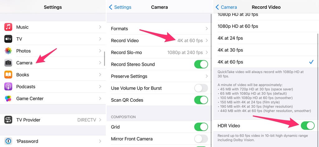 欲关闭HDR视频,请进入设置 > 相机 > 录制视频,将HDR视频开关拨至关闭。此后,所有视频将以标准动态范围录制。