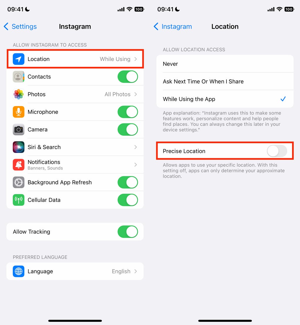 在设置应用中,选择一个应用(如Instagram),点击位置,然后关闭精确位置。关闭后,这些应用只能知道你的大致位置,误差在几英里内。