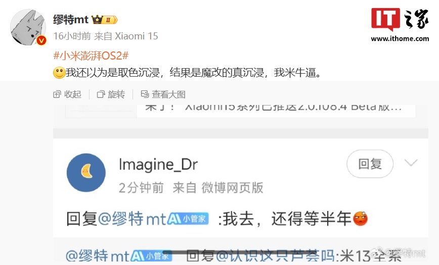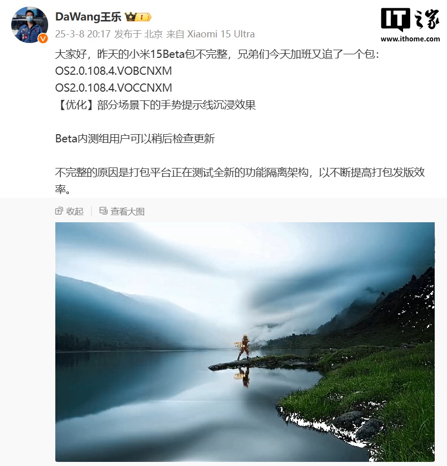 IT之家 3 月 9 日消息,小米公司应用软件部总监王乐昨日晚发文称,小米 15 手机 3 月 7 日的 Beta 包不完整,后追加了更新包 OS2.0.108.4.VOBCNXM / OS2.0.108.4.VOCCNXM,优化了部分场景下的手势提示线沉浸效果。