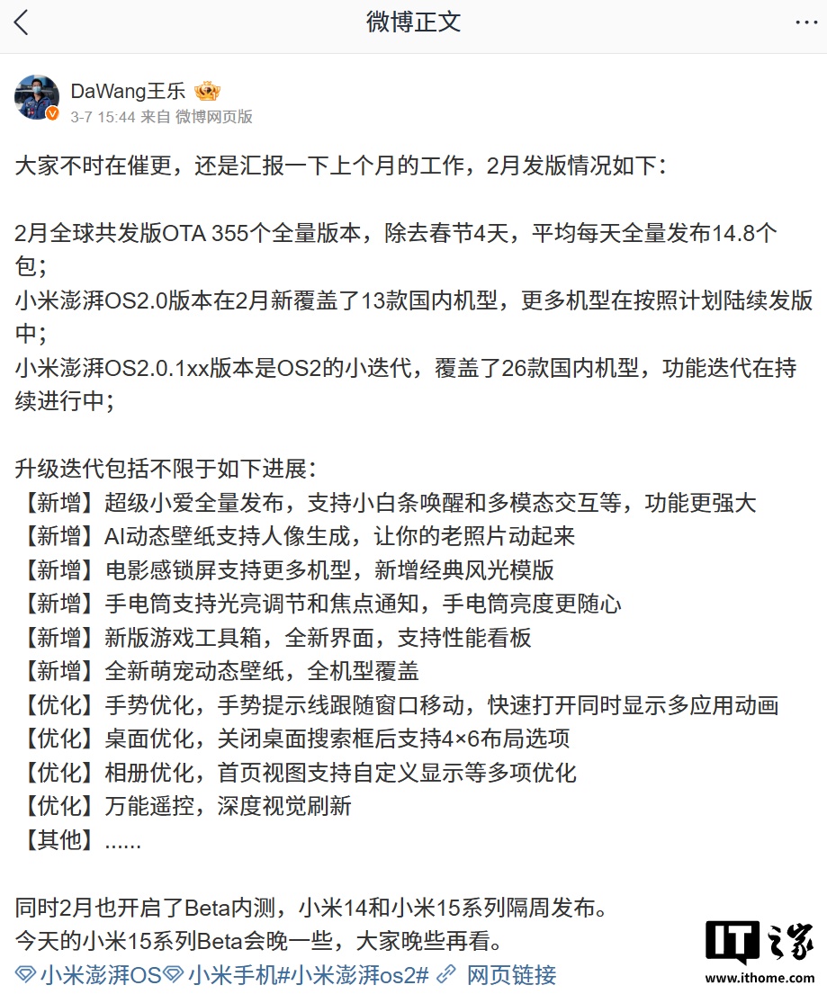 同时 2 月也开启了 Beta 内测,小米 14 和小米 15 系列隔周发布。