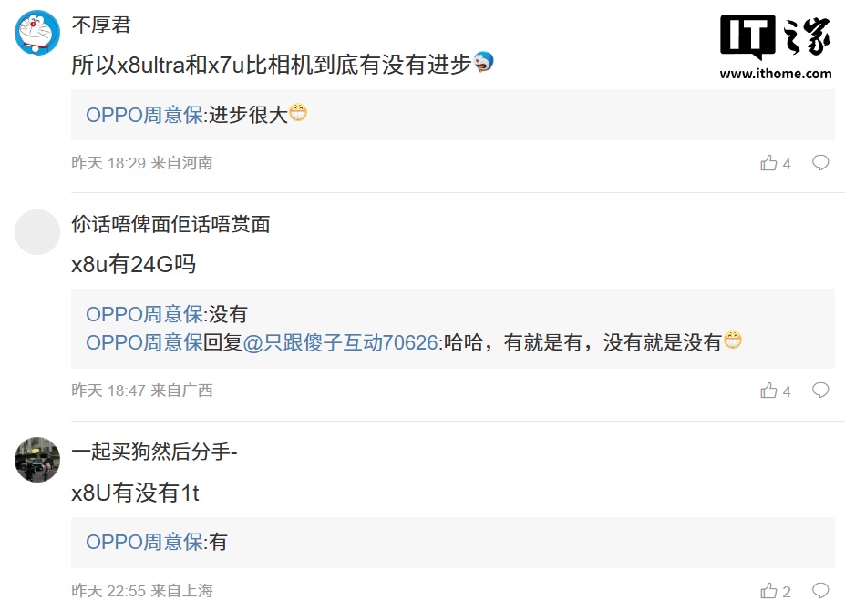 IT之家注意到,OPPO Find 系列产品负责人周意保昨日继续在评论区透露 Find X8 Ultra 信息:针对新机是否会提供“白机身 / 黑镜头”配色,他回复“有的”;针对新机是否配备 3D 超声波指纹,他表示“有”。另外,新机的规格情况也有信息露出:没有 24GB 运存版本、提供 1TB 存储规格版本。