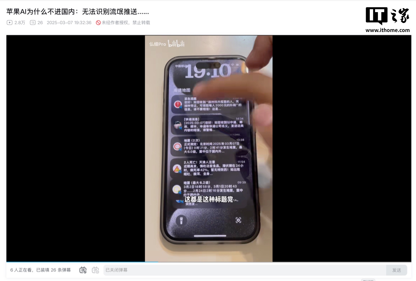 参考视频平台部分用户实测,iPhone 将各种新闻消息推送总结为“首要通知、紧急提醒 —— 天津停电、车辆召回、地震警报、身份证换领、高速免通行、航班突发、食品致病”等,点开详情却发现只是各种 App 的“标题党”风格日常新闻推送通知。