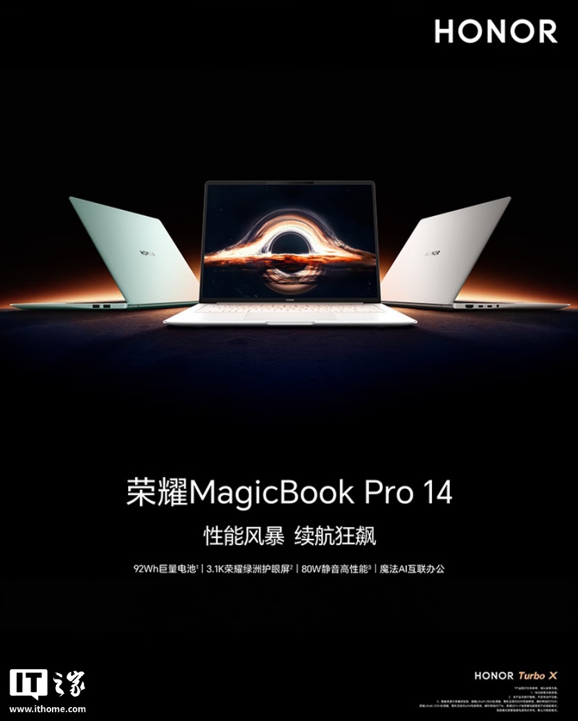 荣耀 MagicBook Pro 14 笔记本发布于今年 2 月,该款笔记本搭载酷睿 Ultra 9 / 5 处理器,拥有 Touch / 非 Touch 版本,内置 92Wh 电池,提供双 2280 SSD 槽。MagicBook Pro 14 还配备 14.6 英寸 3120*2080 分辨率 OLED 屏(比例 3:2),提供 HONOR Turbo X 全域资源调度。