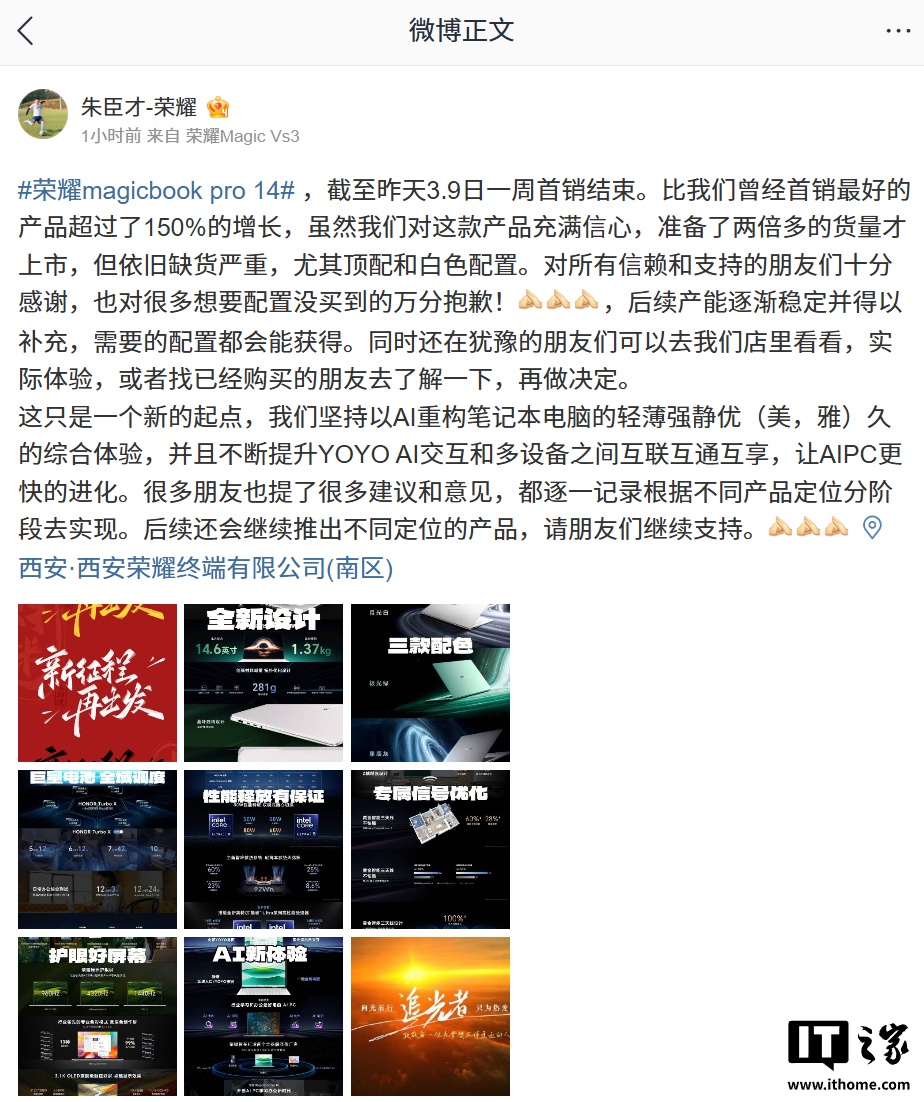 IT之家 3 月 10 日消息,荣耀 PC 产品线总经理 @朱臣才-荣耀 今日发文称,MagicBook Pro 14 笔记本截至昨天首销结束,该阶段的销量较曾经最好产品有超 150% 增长。