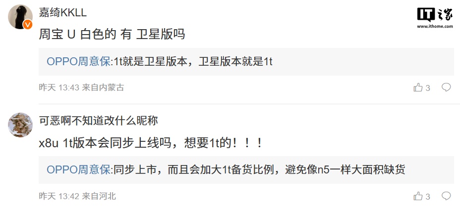 IT之家注意到,周意保昨日继续在微博透露新机更多信息:针对是否会拥有卫星通信功能,他表示“1t 就是卫星版本,卫星版本就是 1t”(此处“1t”预计指 1TB 规格版本);针对 1TB 规格是否会同步上市,他回复“同步上市,而且会加大 1t 备货比例,避免像 n5 一样大面积缺货”。