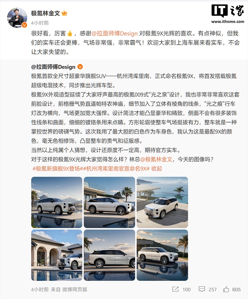 随后,极氪科技集团副总裁林金文转发了该博主的帖子并点评道:有点神似,但我们的实车还会更棒。气场非常强,非常霸气!欢迎大家到上海车展来看实车,不会让大家失望的。