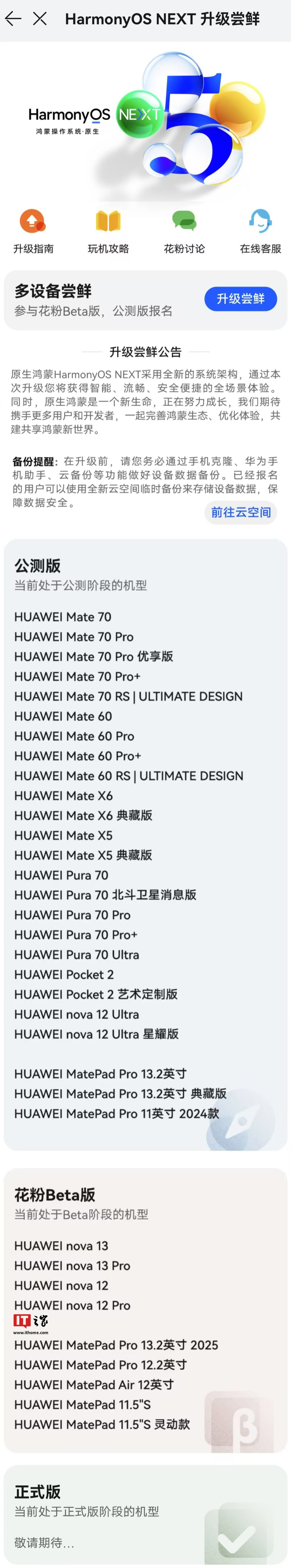 IT之家附华为鸿蒙 HarmonyOS NEXT 系统升级进展情况如下:
