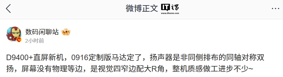 IT之家 3 月 11 日消息,博主 @数码闲聊站 今日发文透露,某厂天玑 9400+ 直屏新机配备 0916 定制版马达,采用非同侧排布的同轴对称双扬方案,屏幕为视觉四窄边 + 大 R 角设计。