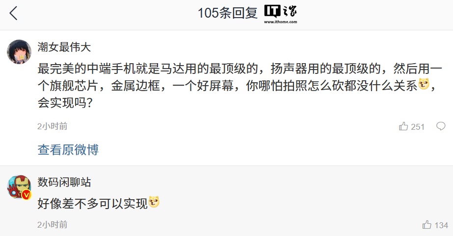 博主还表示新机“整机质感做工进步不少”,结合评论区讨论及暗示来看,该机预计为小米 REDMI K80 至尊版。有网友在评论区提出了自己对完美中端机的看法(顶级马达 + 顶级扬声器 + 旗舰芯片 + 金属边框 + 好屏幕),博主回复“好像差不多可以实现”。