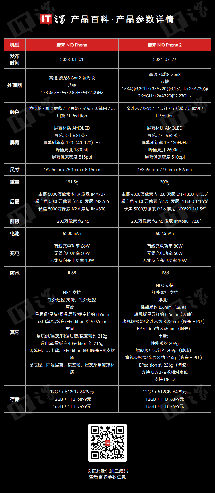 IT之家附蔚来两代 NIO Phone 手机配置表如下: