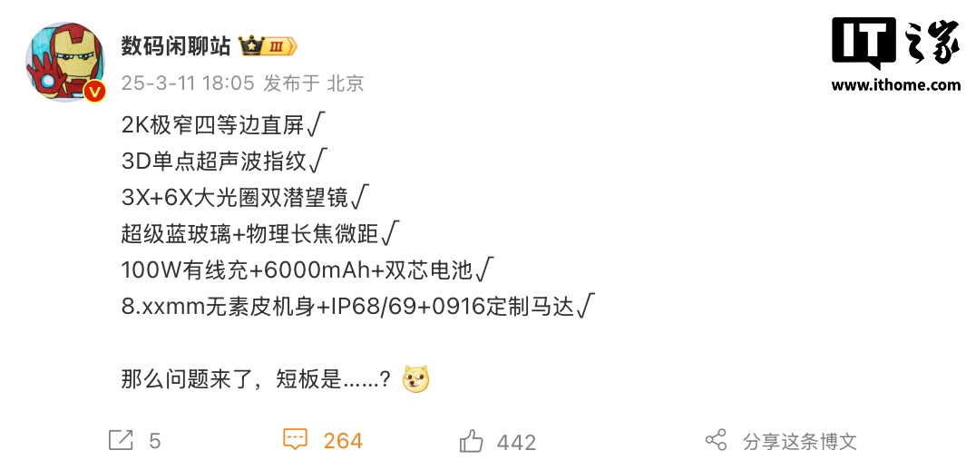 IT之家 3 月 11 日消息,博主 @数码闲聊站今天公布了一款神秘新机的规格信息,该机搭载 2K 极窄四等边直屏,拥有 3D 单点超声波指纹,配备 3X+6X 大光圈双潜望镜,搭载 6000mAh 双芯电池(支持 100W 有线充),采用“8.xx”mm 机身,拥有 IP68/69 认证,同时配备定制马达。