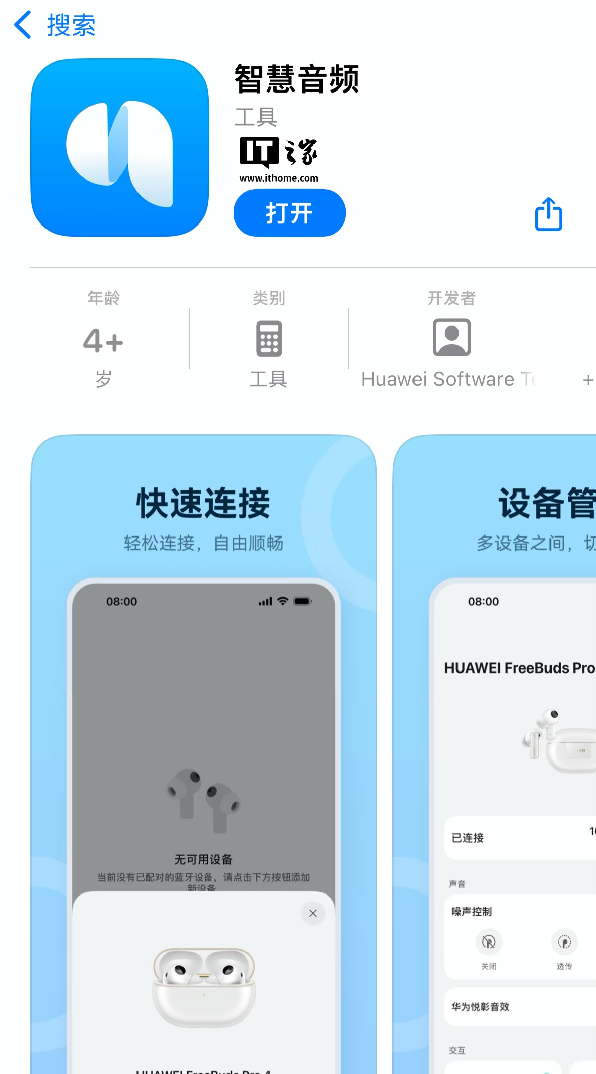 IT之家致电华为客服获悉,该应用于昨日(3 月 10 日)上线,版本号为 1.0.0.301,主要用于华为音频类设备与 iOS 设备进行配对、连接、设置等。苹果 App Store 显示,该应用目前仅适配 iPhone(经实测,iPad 也可安装使用,但未适配 UI 布局)。