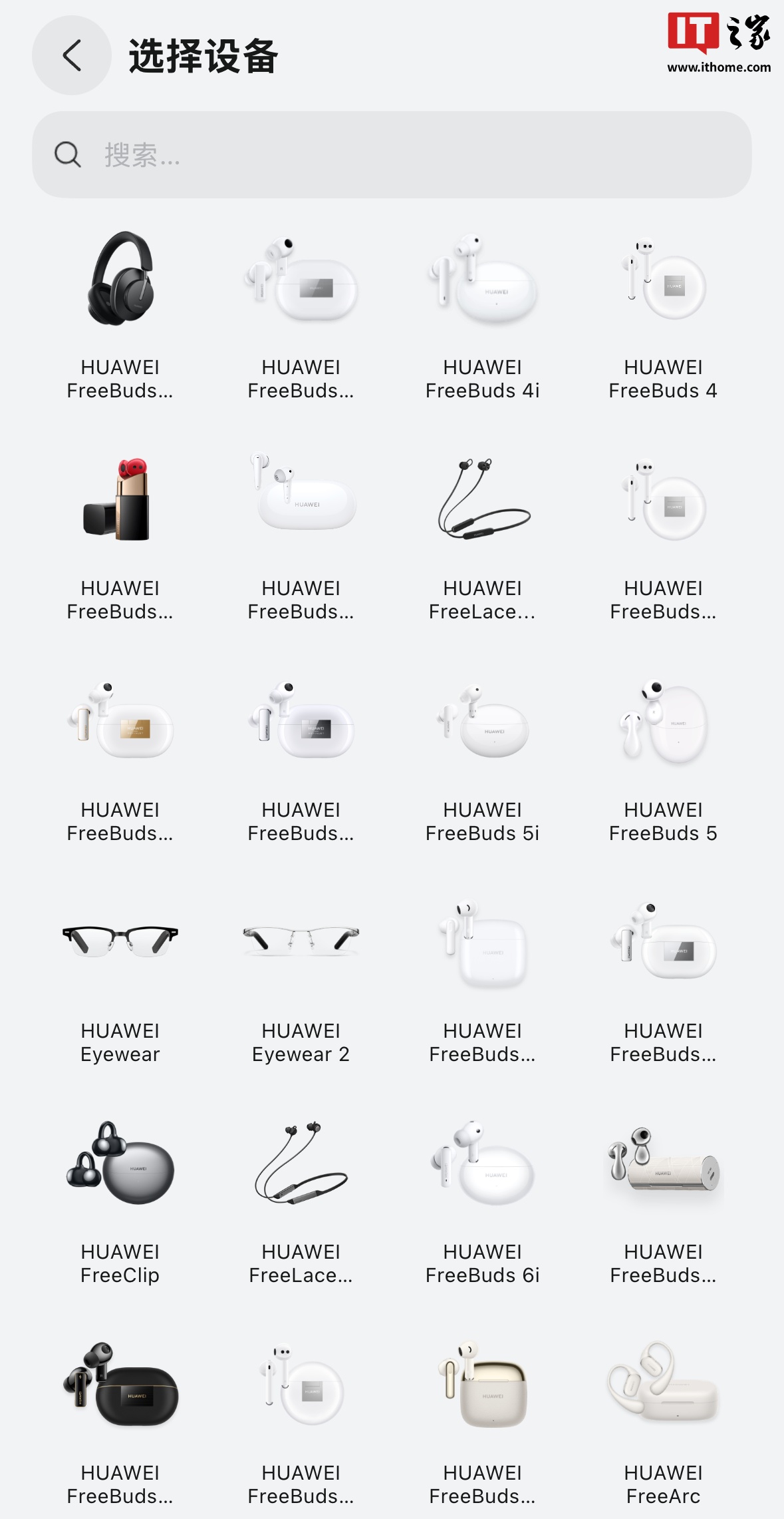 智慧音频 App“添加设备”功能页面显示,其已支持连接 FreeBuds Studio、Eyewear 系列、FreeBuds 数字系列、FreeArc、FreeClip 等 24 款音频类设备(含耳机、眼镜产品),支持设备列表如下: