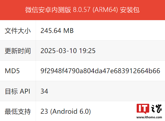就在昨晚(3 月 10 日),微信安卓平台迎来了 8.0.57 测试版更新,IT之家抓取安装包获悉,本次文件大小为 245.64MB。
