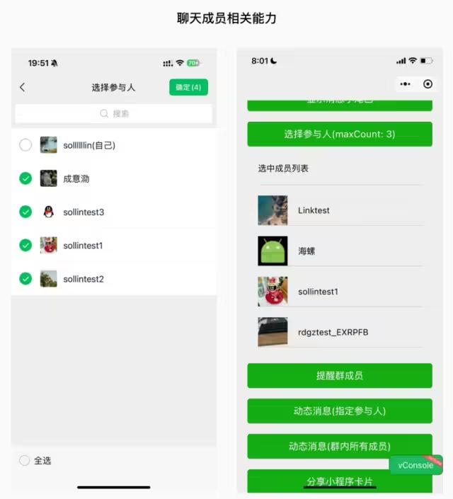 据悉,“聊天工具”模式可用于实现群问卷、群拼单、群任务等功能,与小程序普通模式相比,平台开放了更多与聊天紧密结合的能力:聊天成员相关能力、发送内容到聊天能力和动态消息能力。