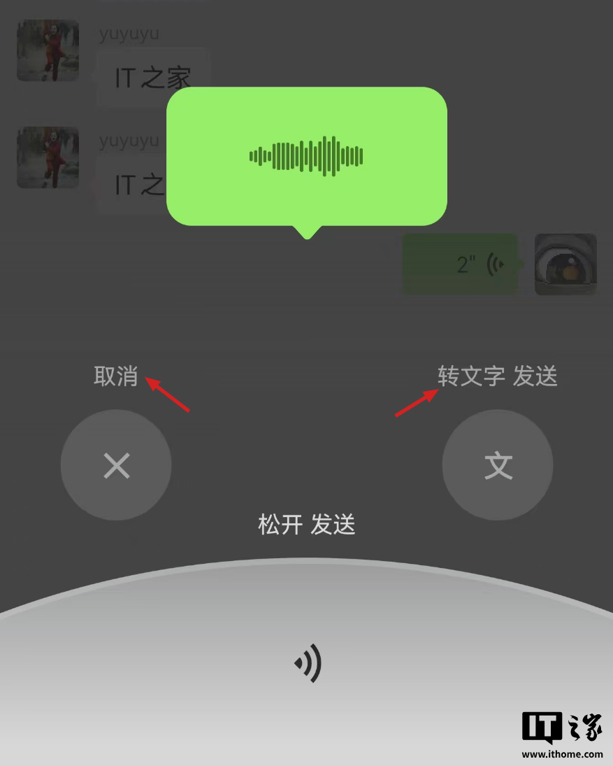 在当下 8.0.57 测试版中,微信进行了优化,给两个选项分别添加了“取消”和“转文字发送”的说明。