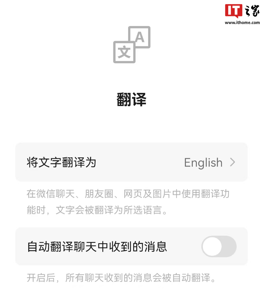 依次点击“我 - 设置 - 通用 - 翻译”,可以看到界面中出现了“自动翻译聊天中收到的消息”开关。