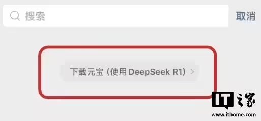 尚未被纳入灰度测试的用户,在搜索界面中有机会看到“下载元宝(体验 DeepSeek-R1)”的提示。