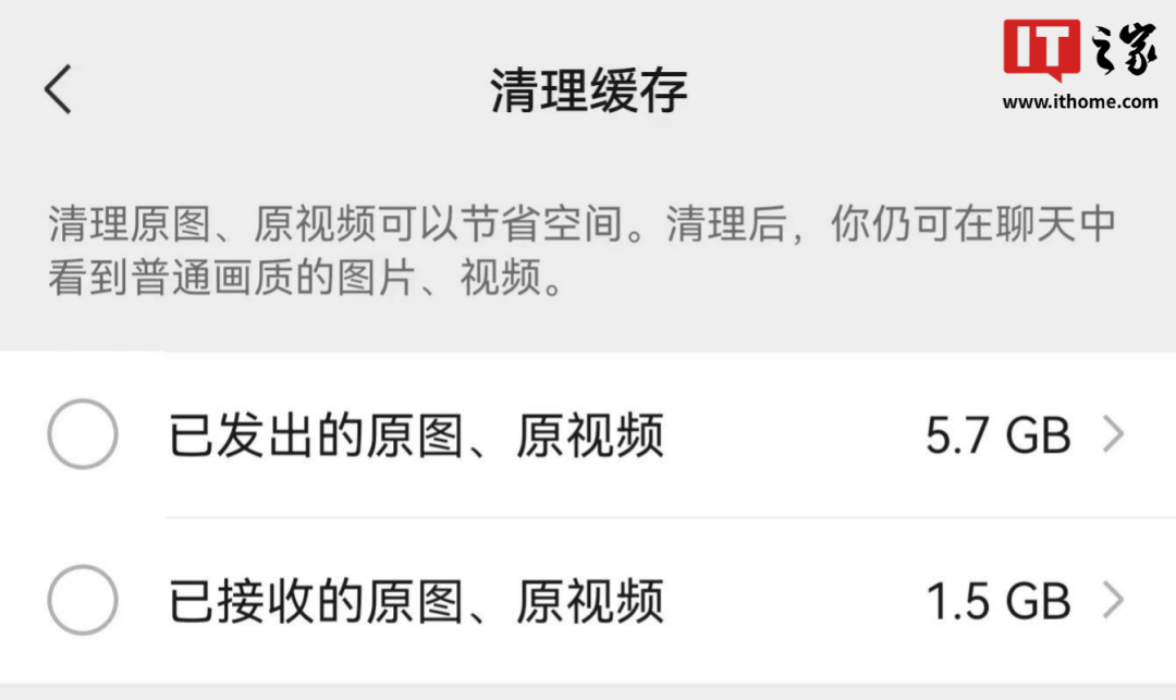 在选项的上方,有一句提醒:清理原图、原视频可以节省存储空间。清理后,你仍可在聊天中看到普通画质的图片、视频。