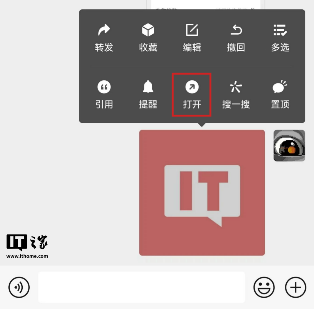 在此次测试版中,如果长按微信聊天中图片,弹出的选项中新增“打开”。