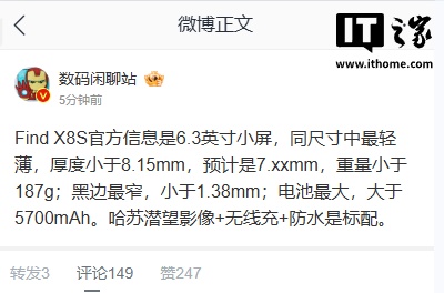 他还透露,OPPO Find X8S 黑边最窄小于 1.38mm(可能是同级别最窄),电池容量大于 5700mAh(可能是同级别最大),依然保留了旗舰级的哈苏潜望影像 + 无线充 + 防水功能。