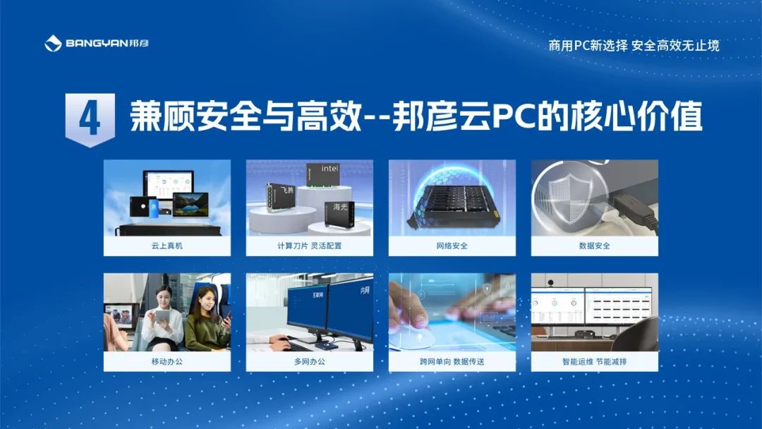 邦彦云PC的思路是,兼顾安全和高效两大关键要素,改变传统的商用办公模式。