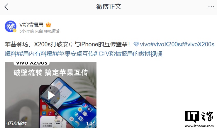 据介绍,vivo X200s 手机支持「破壁流转」,可接 iPhone 电话、接收 iPhone 短信 / 通知等信息,同时还支持 iPhone 位置共享(视频画面显示,iPhone 端需下载 vivo 推出的互传 App)。