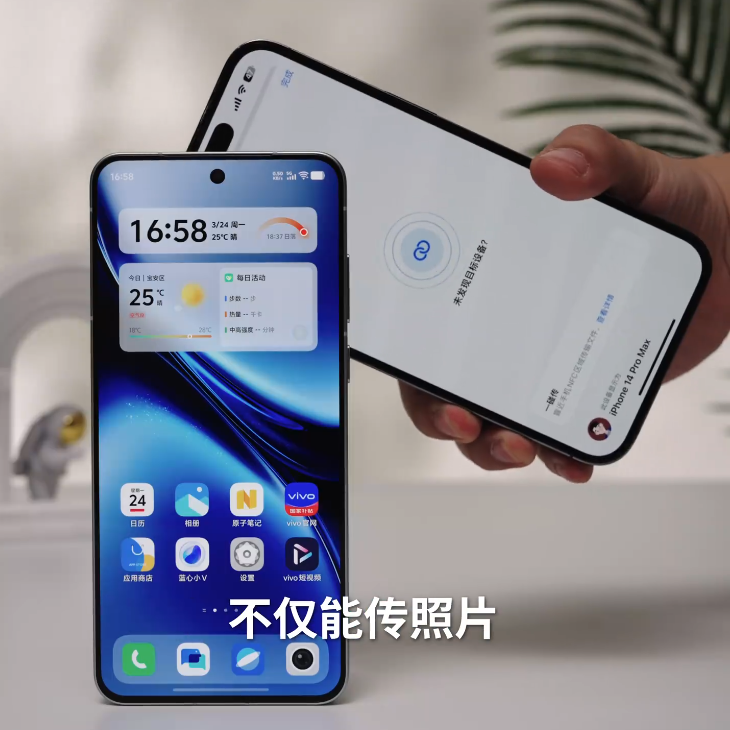 vivo X200s 手机还支持与 iPhone 碰一碰互传 LivePhoto 和文件,同时 iPhone 备忘录能够通过互传 App 分享给 X200s。视频还展示了 vivo X200s 手机的正面形象,其采用窄边框 + 居中单挖孔设计,(预计为视觉四等边设计:上左右三边等宽、下巴稍宽)。