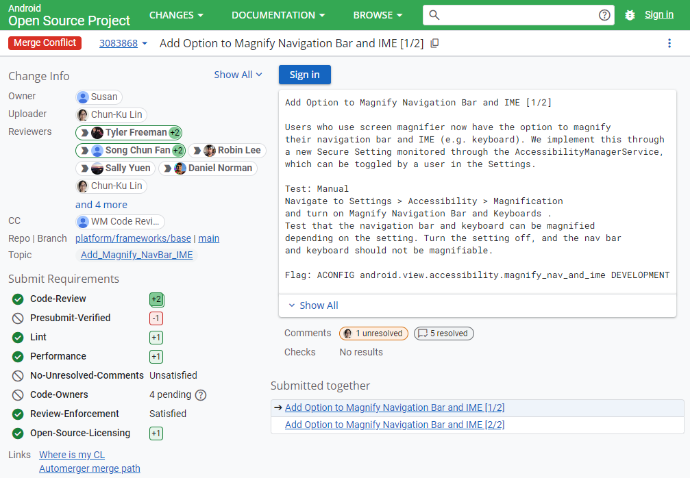 Android Authority 在报道中举了个例子:有个亚马逊的程序员给安卓系统提交了个补丁,允许系统里的放大镜工具放大导航栏以及输入法的界面。