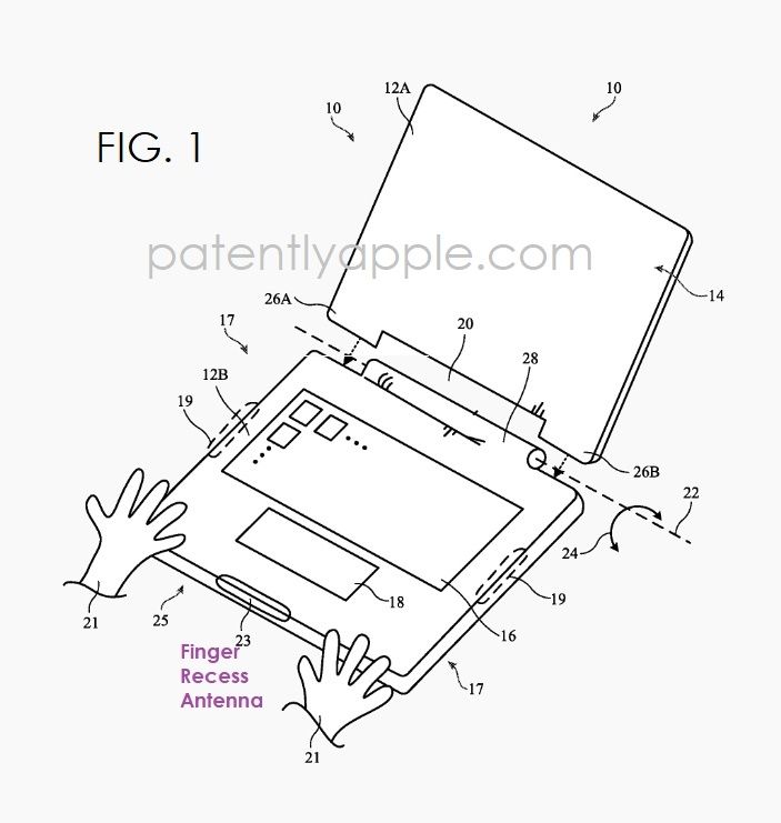 在第二项专利中,显示天线可能放在屏幕和键盘的交合处: